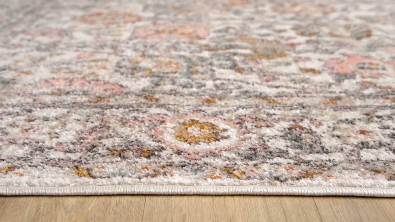 The Herstmonceux Area Rug brings classic Persian-inspired style into your home with an intricate allover floral and botanical pattern set against a soft cream and ivory background. Delicate blush pink blooms, muted teal accents, warm orange and gold details, and gray scrolling vines weave together across the field, all framed by a traditional ornate border. The palette is beautifully soft and feminine — think faded garden florals with a slightly vintage, sun-washed feel.