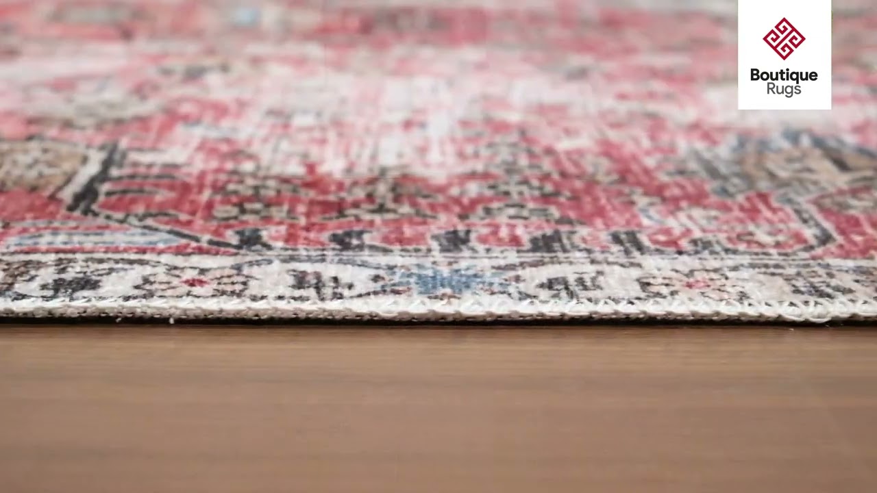 The Holi-2303 is a stunning washable vintage-style area rug that brings the timeless beauty of Persian design into modern homes. Its rich burgundy and red base is layered with intricate allover floral and medallion motifs, framed by a classic ornate border — all rendered in a beautifully faded, distressed finish that gives it that coveted antique look. Accents of slate blue, soft gray, and white weave through the pattern, adding depth and sophistication without overwhelming the warm, jewel-toned palette.