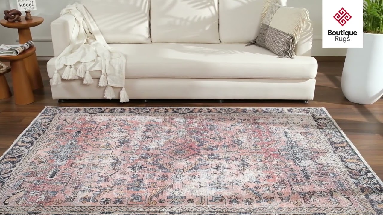 A blush-and-navy Persian medallion rug with a beautifully faded vintage look — and it goes straight in the washing machine. Soft, flat-weave, rubber-backed.