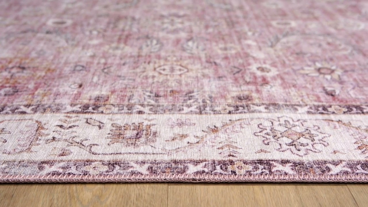 A dreamy blush pink Persian-style rug with a soft distressed finish — customers say it's even prettier in person. Pet friendly, low pile, and endlessly versatile.