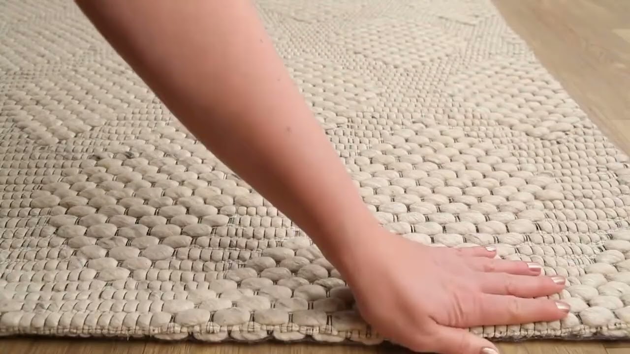 Hand-woven 100% wool in soft ivory with a subtle geometric diamond weave — a clean, neutral flatweave that works in almost any room.