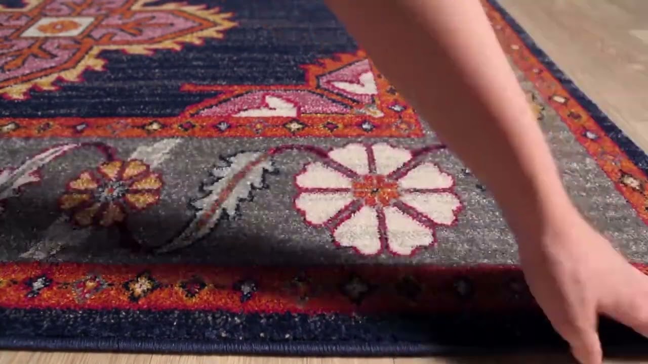 The Kaitlyn Navy Area Rug is a showstopper — a deep navy blue field anchors three bold geometric medallions framed by a floral-and-leaf border in a vibrant palette of orange, yellow, lavender, pink, and gray. The design draws from classic Persian and Turkish traditions but feels fresh and colorful enough to energize any modern space. Machine woven from 100% polypropylene in Turkey, this rug is built for real life: it's stain resistant, easy to spot clean, and durable enough for high-traffic areas like living rooms, entryways, and dining rooms.