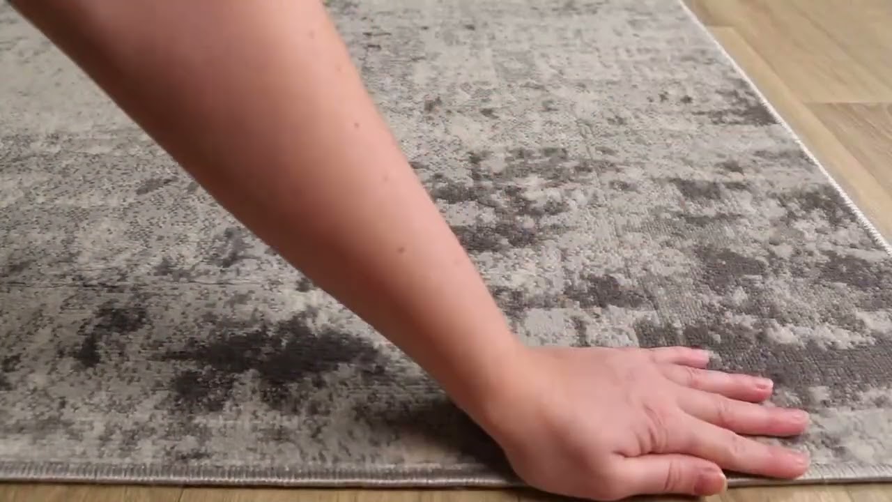 A beautifully distressed abstract rug in soft grays and cream — stain resistant, high-traffic ready, and effortlessly modern in any room.