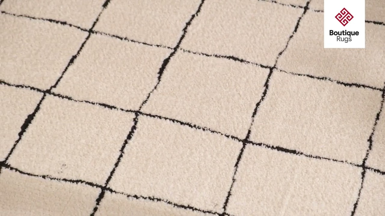 A plush ivory shag rug with an artsy black grid pattern that looks hand-sketched — modern, minimalist, and soft enough to sink your toes into.