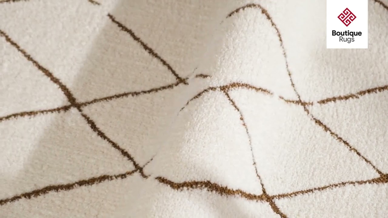 warm paletteA warm, airy cream dominates the entire field, with rich caramel-brown lines tracing the diamond lattice pattern — the contrast is soft and inviting rather than stark, giving the rug a naturally earthy, sun-warmed feel.
