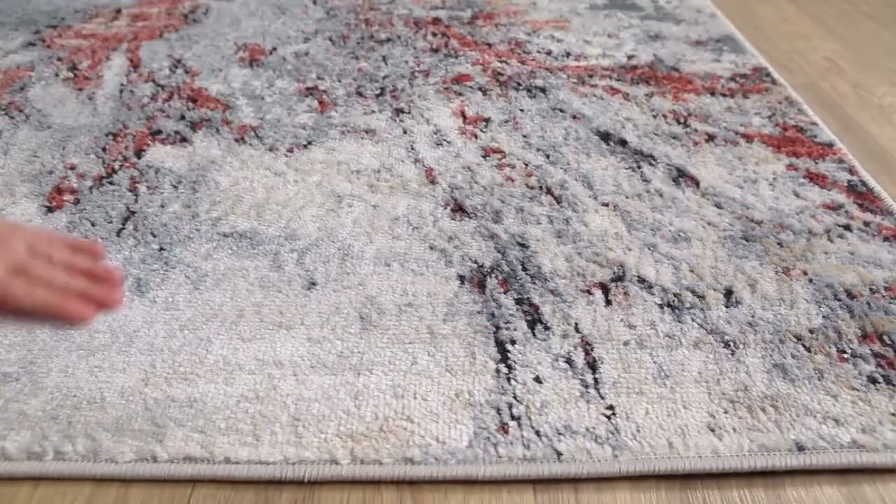 Bold marble swirls in silver-gray, white, and deep red make the Kirkland rug a dramatic modern centerpiece — durable polypropylene construction built for everyday living.