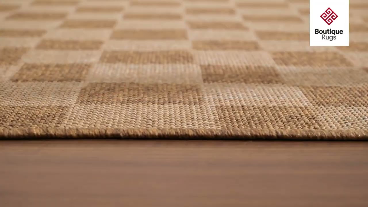 A warm, tone-on-tone brown checkerboard flatweave that goes from patio to mudroom without missing a beat — stain resistant, weather proof, and effortlessly modern.