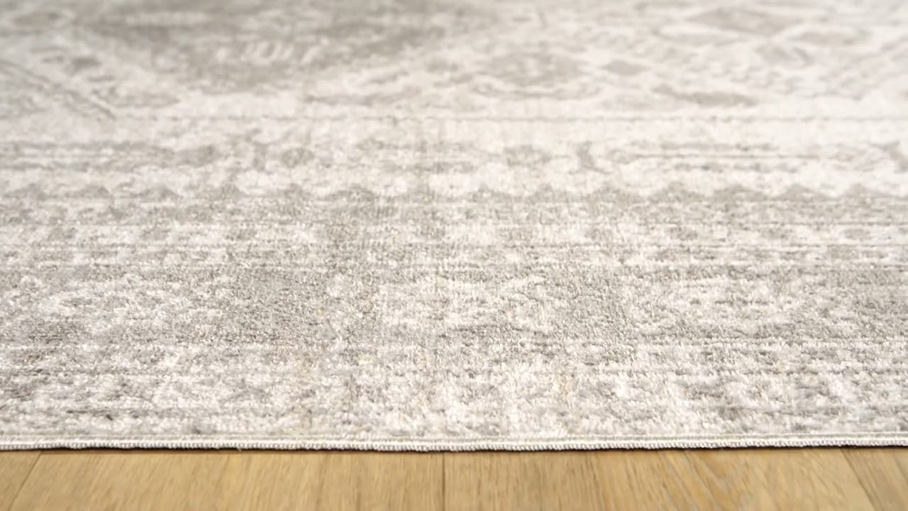 A classic medallion design in soft gray and cream with a beautifully faded finish — and it's fully machine washable. Traditional style that actually handles real life.