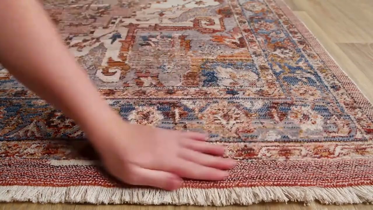 The Lappe Area Rug brings the timeless beauty of Persian and Oriental design into your home with a warm, earthy palette of rust, cream, and blue. At its center sits a bold medallion framed by intricate floral scrollwork and a classic multi-layered border — the kind of pattern that anchors a room and draws the eye in. The distressed, vintage-inspired finish gives it a lived-in, antique quality without looking worn out.