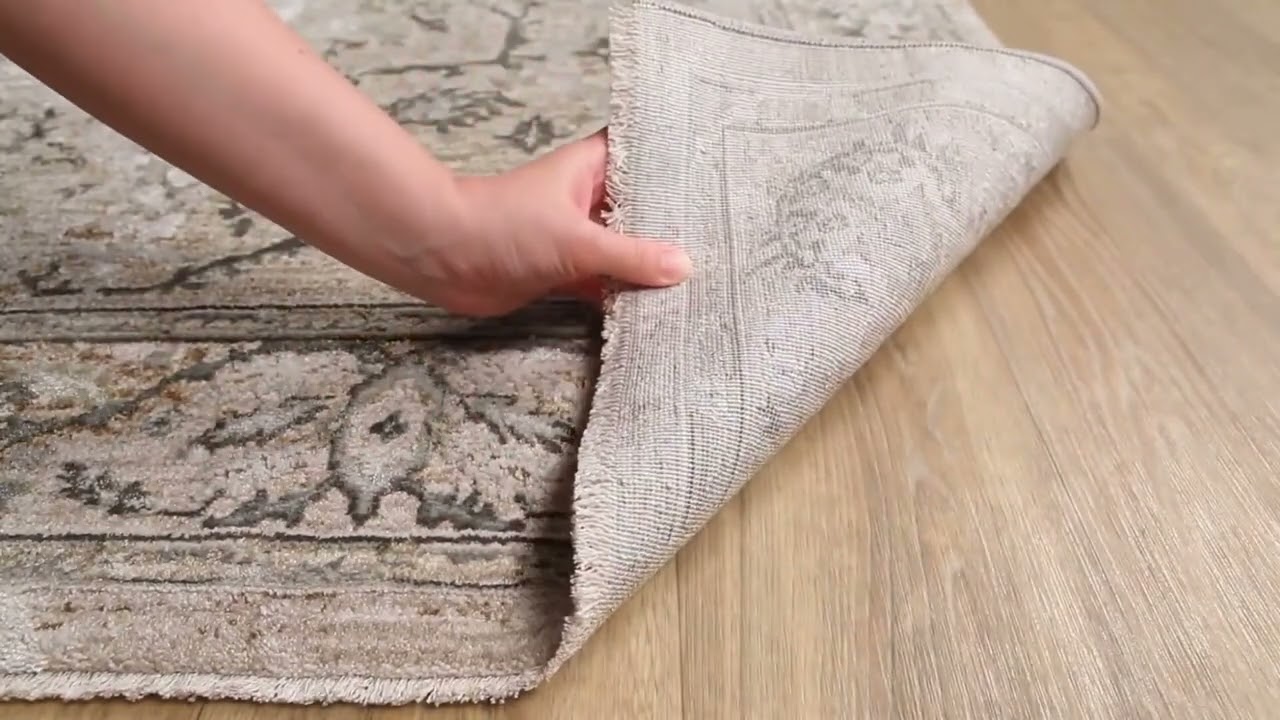 A softly faded traditional medallion rug in warm beige, cream, and gray — the kind of neutral that goes with everything and gets better with every glance.