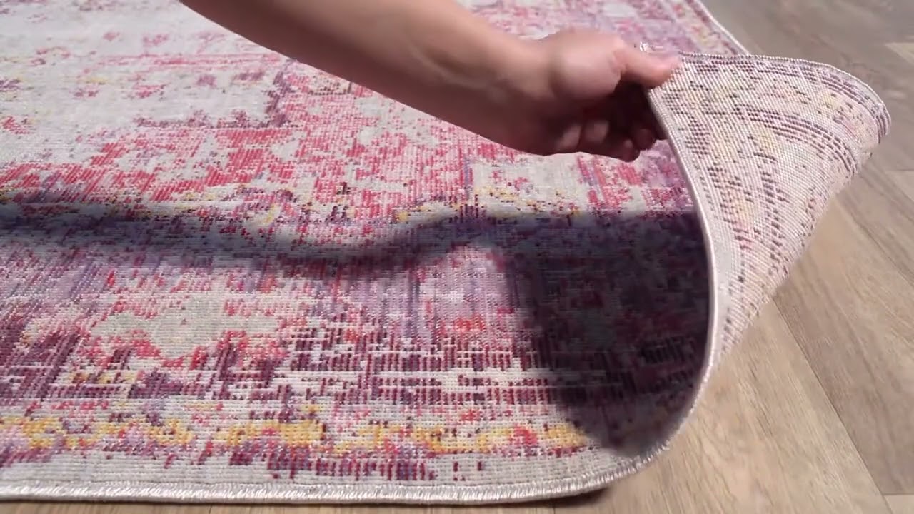 The Laureldale Area Rug brings a burst of jewel-toned color to any room with its vibrant pink and purple palette layered over a soft gray and cream base. Styled after classic Persian medallion designs, the rug features a beautifully distressed, faded finish that gives it a vintage, lived-in character — without looking worn out. The central medallion is framed by intricate floral scrollwork and a multi-layered border, all rendered in hot pink, lavender, and golden yellow accents that pop against the muted background.