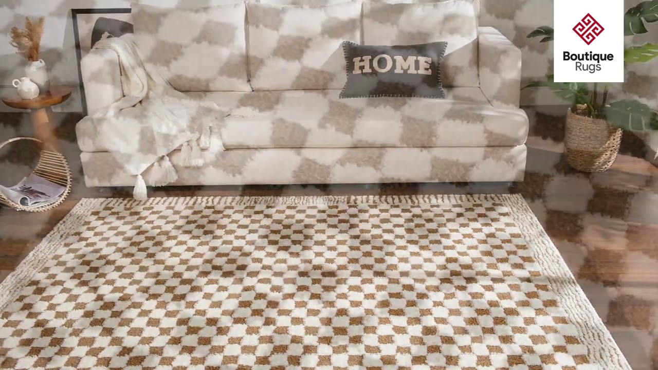 A warm brown and cream checkerboard plush rug with fringe edges — bold enough to be a statement piece, neutral enough to go with everything.