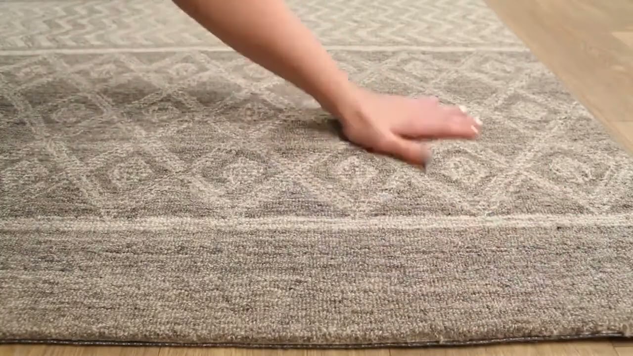 neutral paletteA warm, tonal palette of sandy beige and soft cream dominates the surface, with muted gray woven through the geometric motifs to create gentle contrast. The overall effect is calm and earthy — like natural linen and undyed wool layered together.