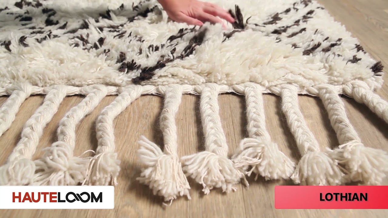 Bold Moroccan diamond motifs, plush 100% wool pile, and long boho tassels — the Lothian brings authentic global character to any room in warm cream and brown tones.