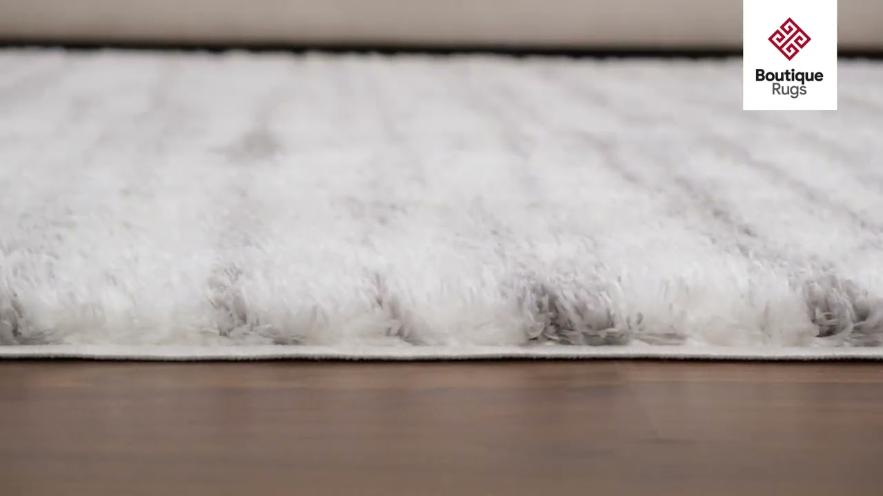Soft horizontal stripes in white and gray meet a thick 1.18" plush pile — the Lotta rug is the definition of modern comfort for any room.