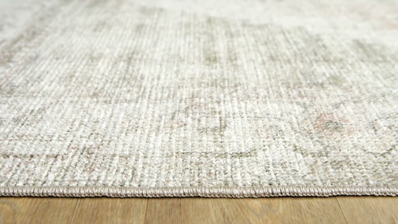 A softly faded medallion rug in cream, gray, and warm beige — traditional Persian style with a gentle distressed finish that works in any neutral room.