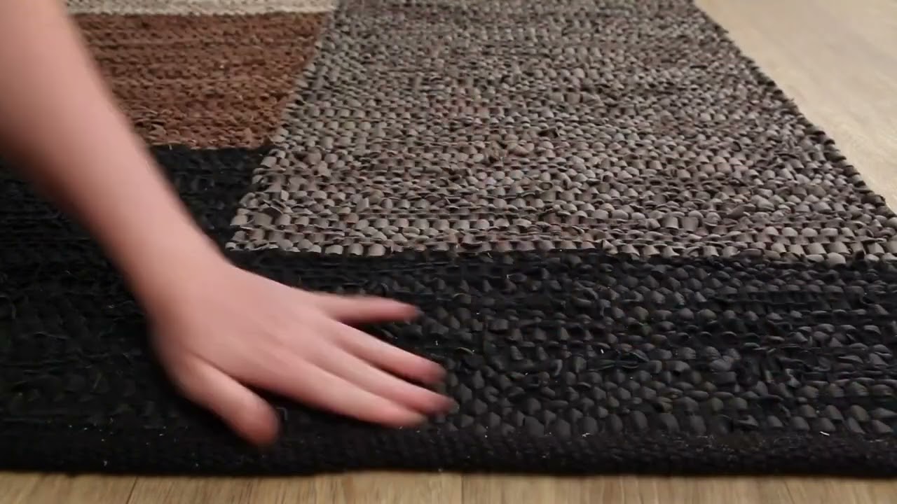 Bold color-block panels in earthy browns, grays, and black — this hand-woven leather and cotton rug is a genuine statement piece with real texture and lasting character.