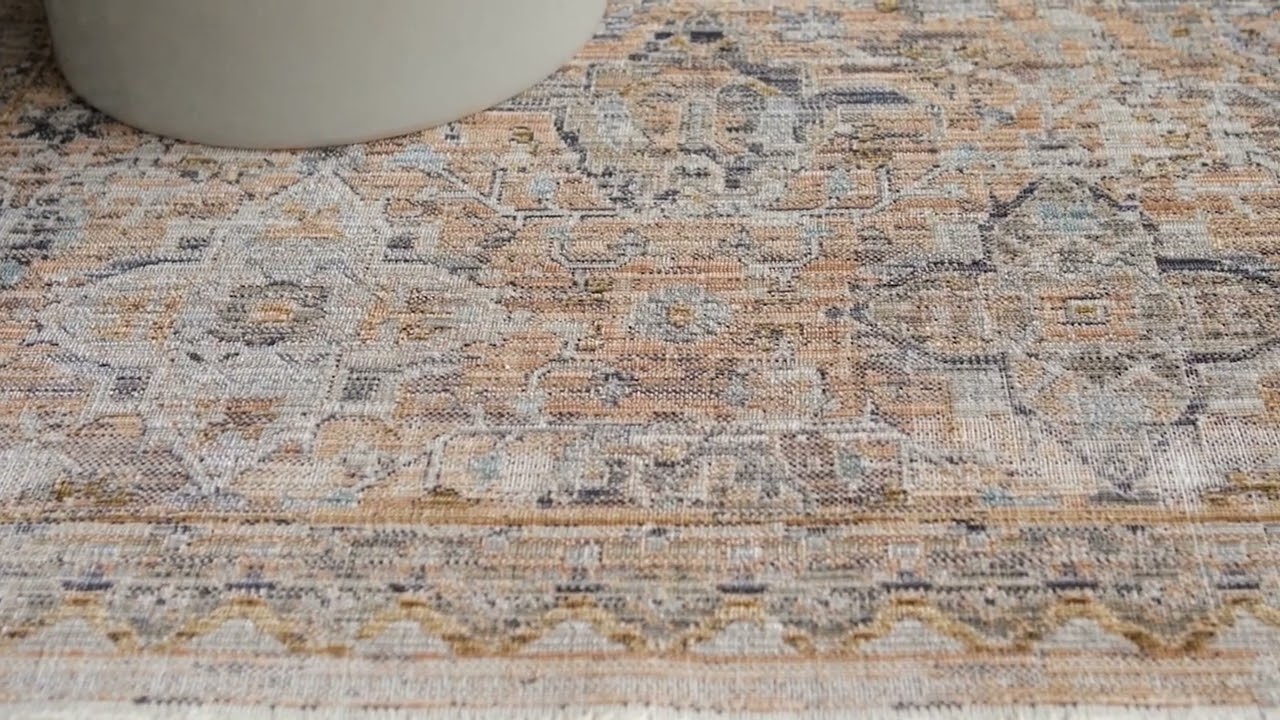 The Margaret area rug brings timeless traditional style to any space with its beautifully distressed, faded Persian-inspired pattern in warm tones of beige, tan, gray, dusty blue, and golden mustard. The allover floral and medallion motifs have a softly worn, antique quality that feels both classic and effortlessly livable. Machine woven from durable 100% polyester, this low-pile rug is built for real life — it's fully machine washable, stain resistant, and outdoor safe, making it ideal for high-traffic areas, covered patios, or anywhere pets and kids roam.