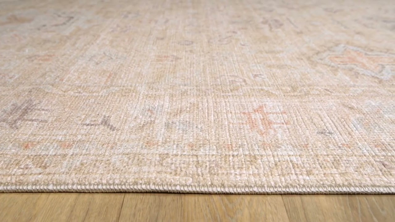 The Marlene Area Rug from Becki Owens x Livabliss brings the timeless beauty of traditional Oushak-inspired design into a modern home. A warm beige and tan base is layered with repeating diamond medallion motifs, delicate floral scrollwork, and subtle accents of dusty blue and rust — all rendered in a softly faded palette that feels both classic and effortlessly current. The intricate damask-style pattern is framed by a refined border, giving the rug a polished, finished look that anchors any room.