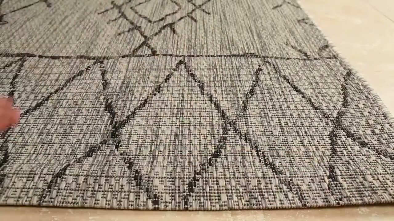 Relaxed Moroccan diamond pattern in warm beige and charcoal — outdoor safe, stain resistant, and zero shedding. Looks great everywhere from patios to dining rooms.