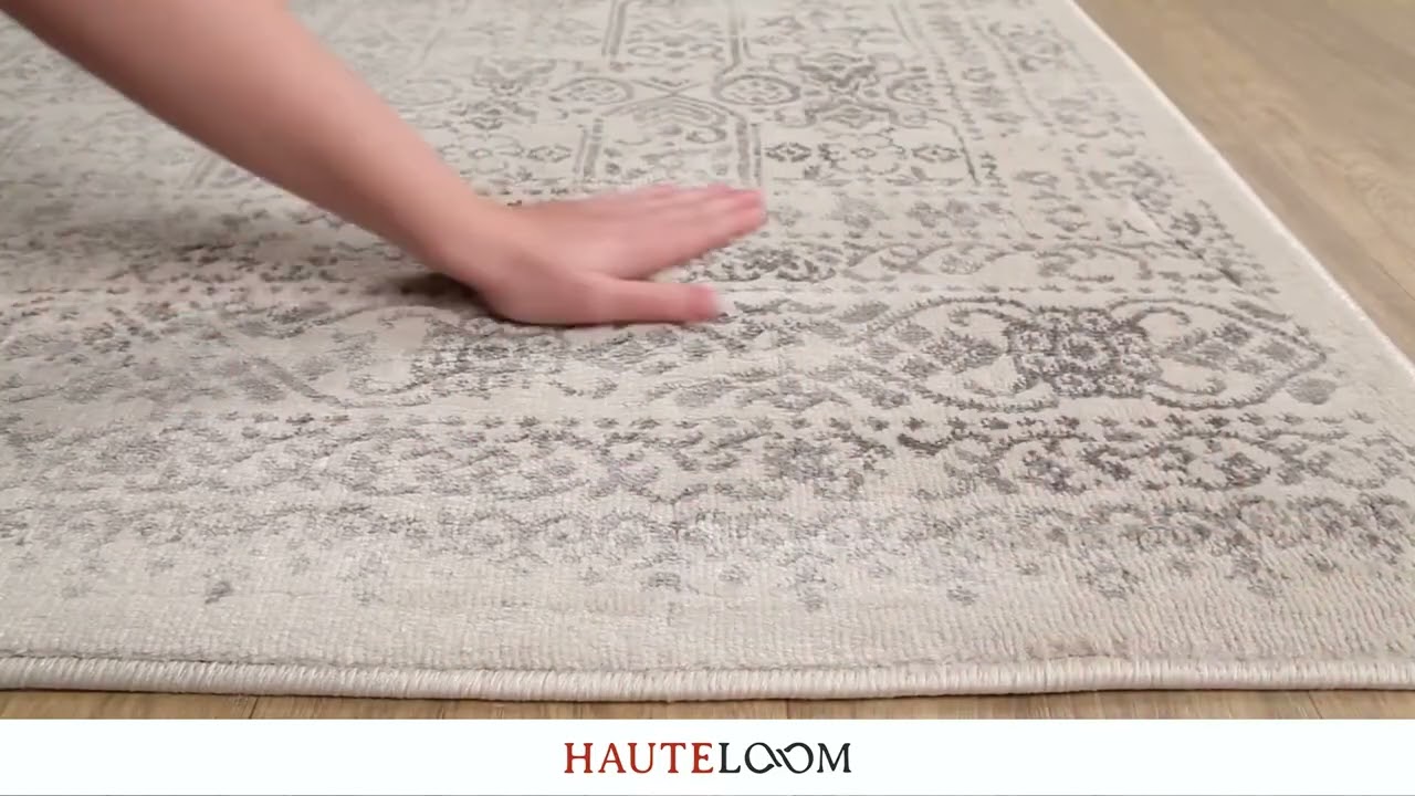 A beautifully faded cream and gray Persian-inspired floral rug with intricate allover scrollwork — timeless elegance that works in any room and holds up to everyday life.
