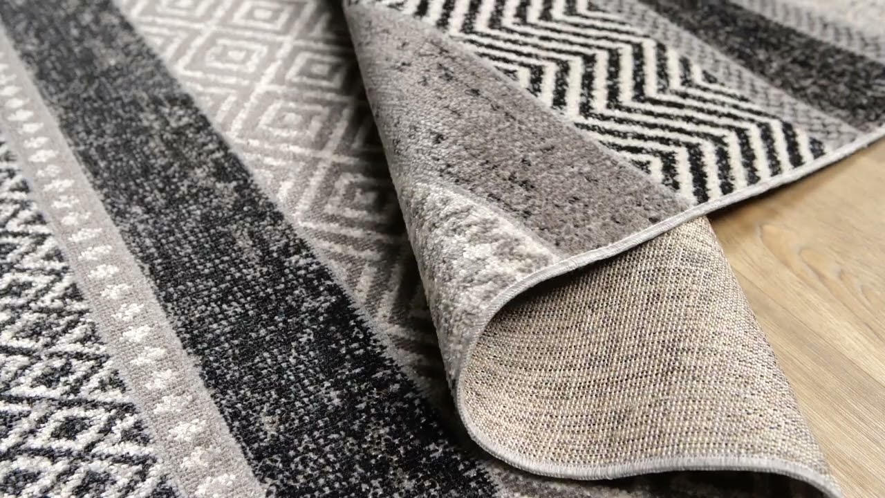 Bold horizontal bands of chevron, diamond, and herringbone patterns in cool gray and black — and it's fully machine washable. The Middlestown is style meets practicality.