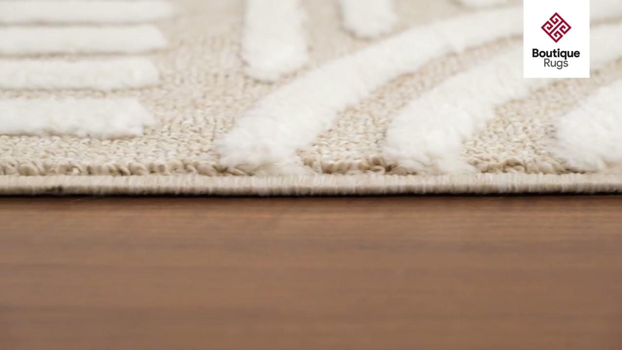 The Moise Area Rug brings a fresh, modern energy to any room with its bold geometric arc and stripe pattern rendered in a warm beige and cream palette. Inspired by mid-century modern and retro design, the repeating arch motifs and concentric lines create a graphic, almost sculptural look that feels both timeless and on-trend. Machine-made from durable polypropylene, this rug is built to handle everyday life while maintaining its crisp, clean aesthetic.
