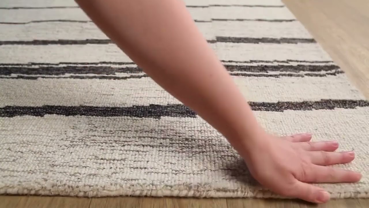 Bold broken stripes in charcoal and cream give this hand tufted 100% wool rug a graphic, artistic edge — modern minimalism you can walk on.