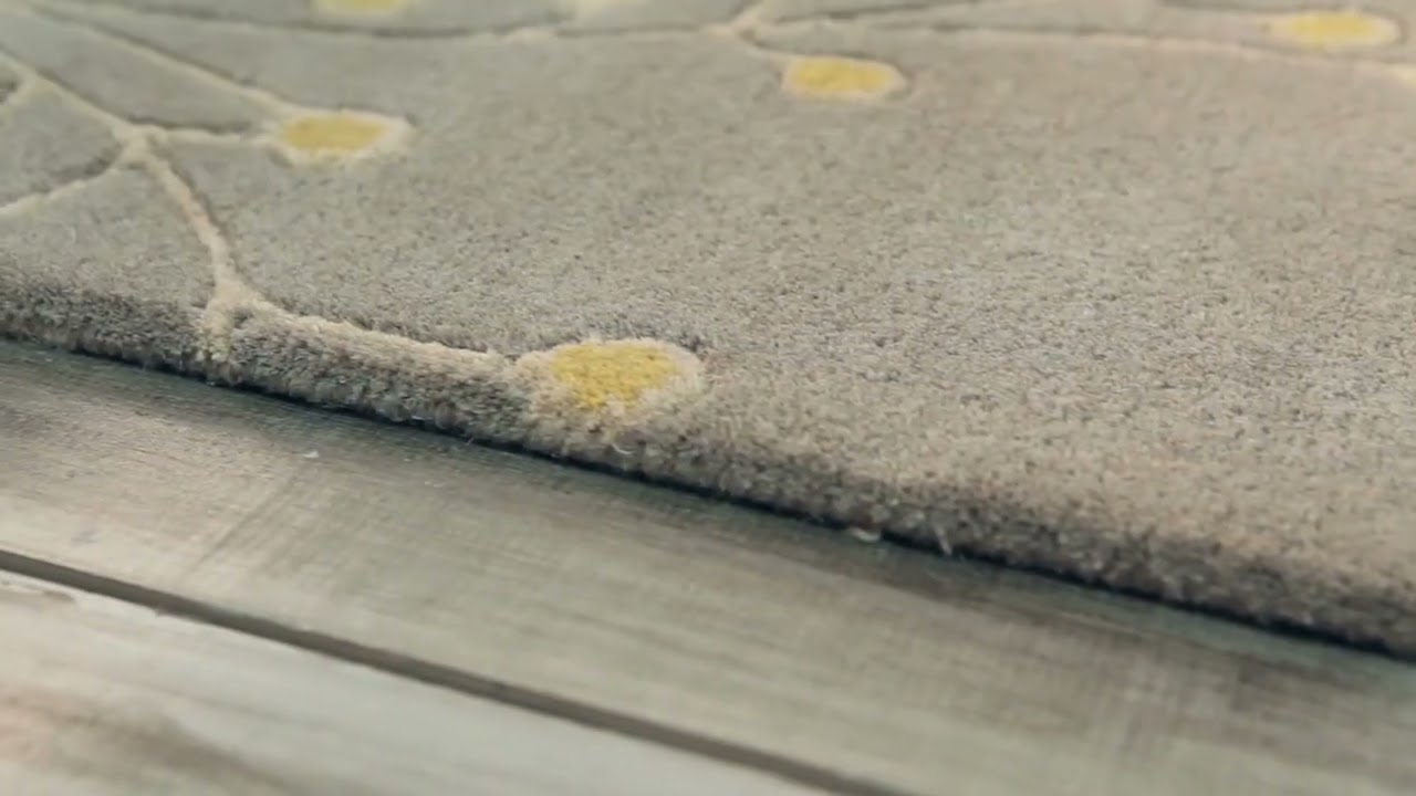 Delicate mustard branches and golden berries drift across a warm gray wool ground — this hand-tufted botanical rug adds organic warmth to any modern or transitional space.