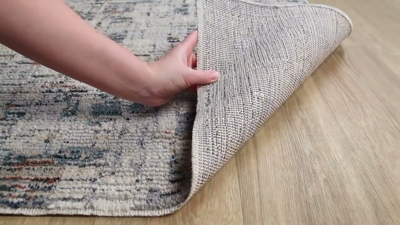 A painterly abstract in slate blue, gray, and rust with a subtle sheen and fringe trim — the Nalus brings effortless modern-boho style to any room.