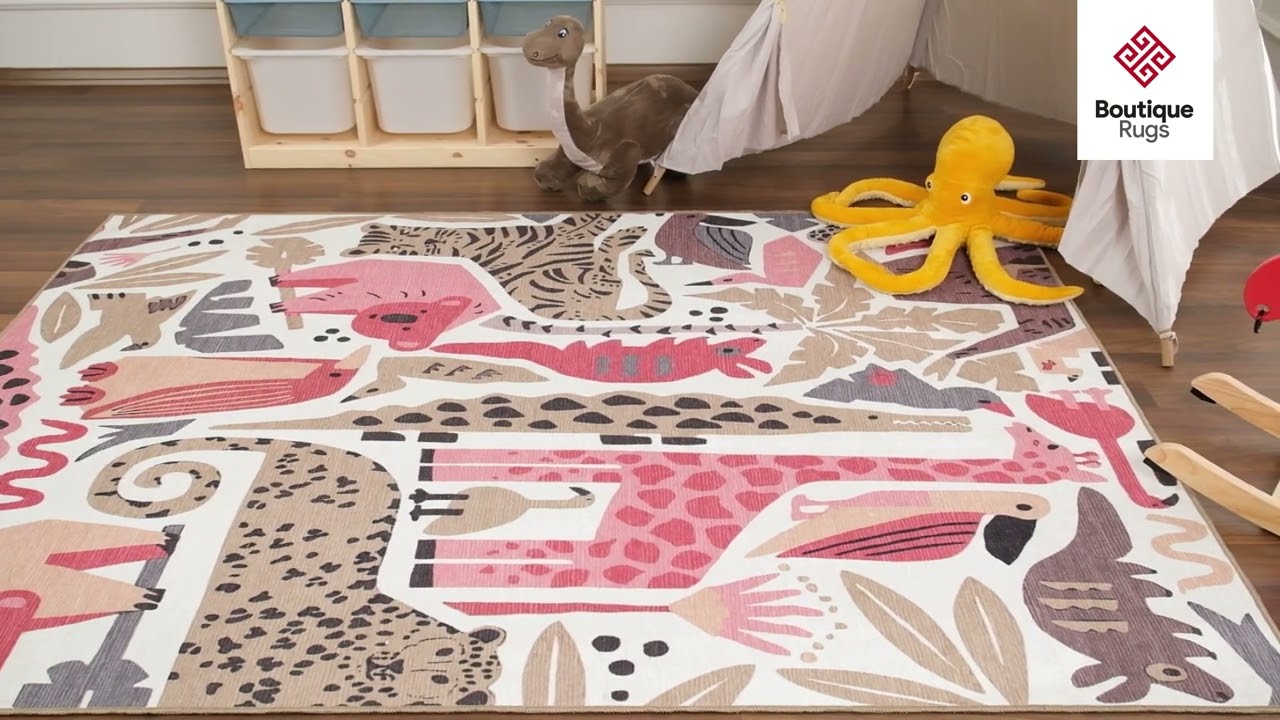 A whimsical jungle scene in soft pinks and cream, packed with giraffes, koalas, and leopards — and it's fully machine washable for easy family living.
