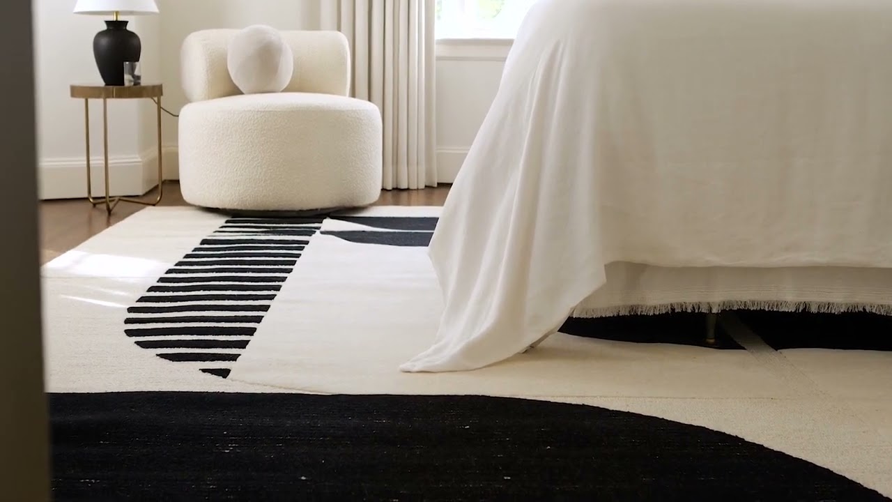 The Brooklyn Modern Area Rug is a striking statement piece that brings bold graphic energy to any room. Featuring oversized black semicircles, a full circle, and a dramatic quarter-circle filled with alternating black and white stripes — all set against a crisp off-white ground — this rug looks like a piece of contemporary wall art you can walk on. Hand tufted from 100% wool in India, it has a satisfying medium pile (0.31 inch) with a slightly textured, high/low surface that adds depth and dimension.