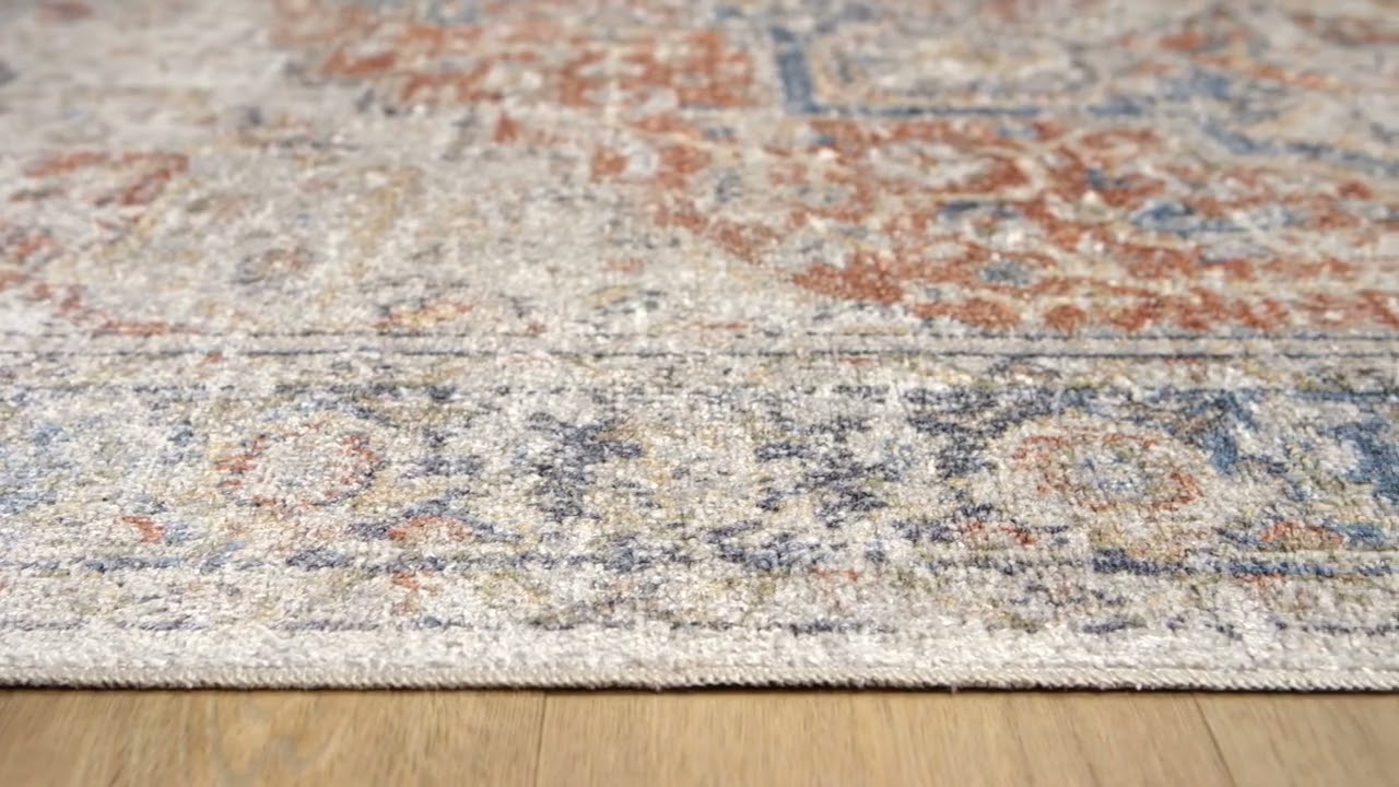 A vintage Persian medallion in warm rust, dusty blue, and cream — fully machine washable and stain resistant for real-life living.