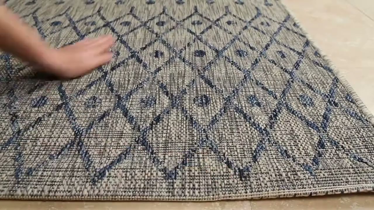The cool blue-on-beige palette pairs effortlessly with natural wood furniture, rattan accents, and coastal or boho-inspired outdoor decor. A versatile, hardworking rug that looks far more expensive than it is.