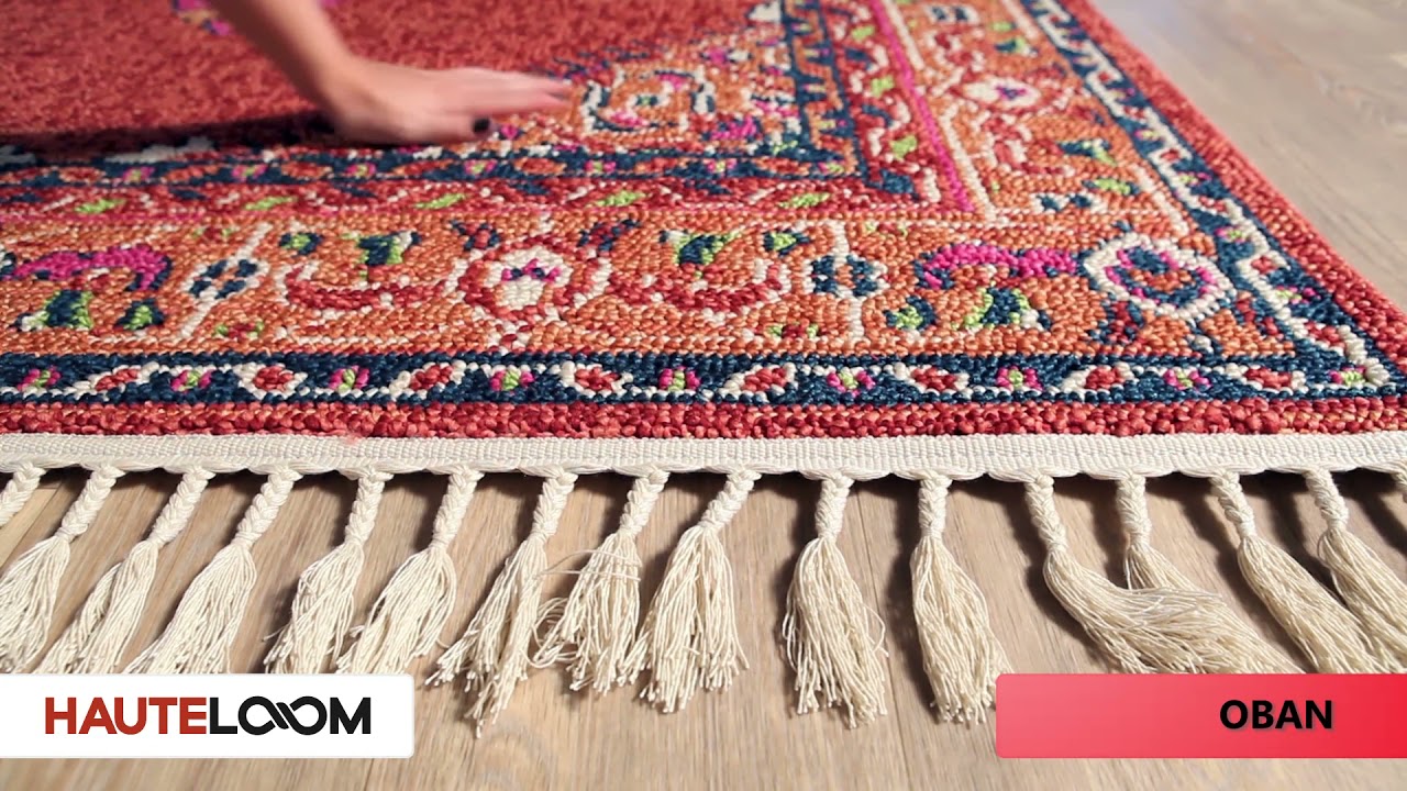 The Oban Traditional Area Rug is a showstopper rooted in classic Persian design — a bold, jewel-toned medallion anchors the center against a rich red field, surrounded by intricate geometric and floral motifs in deep navy, vibrant purple, warm orange, and cream. A multi-layered border frames the whole composition with the kind of ornate detail you'd expect from a hand-crafted heirloom, yet this rug is machine woven from durable, stain-resistant polypropylene for real-life performance. The cream fringe tassels along the short edges add an authentic, artisan-inspired finishing touch.
