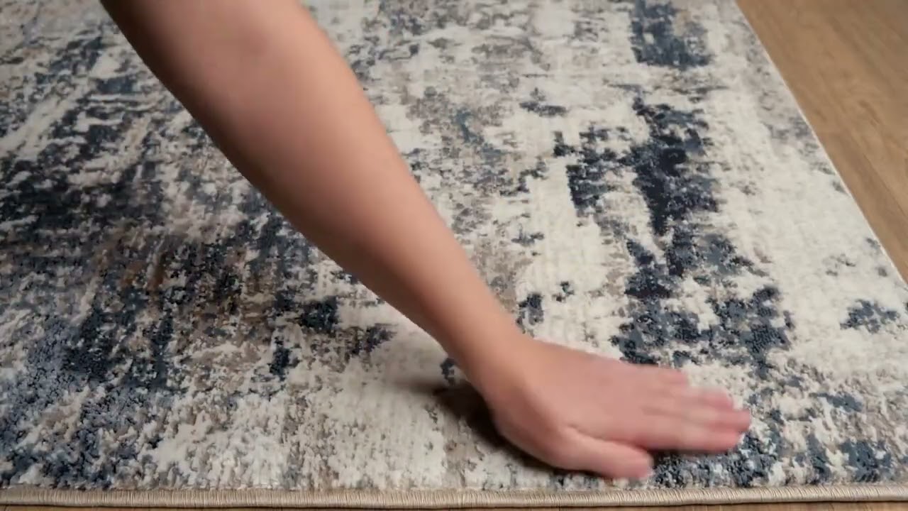 A cool-toned abstract distressed design in slate blue, gray, and ivory — the Ord brings effortless modern sophistication to any room.