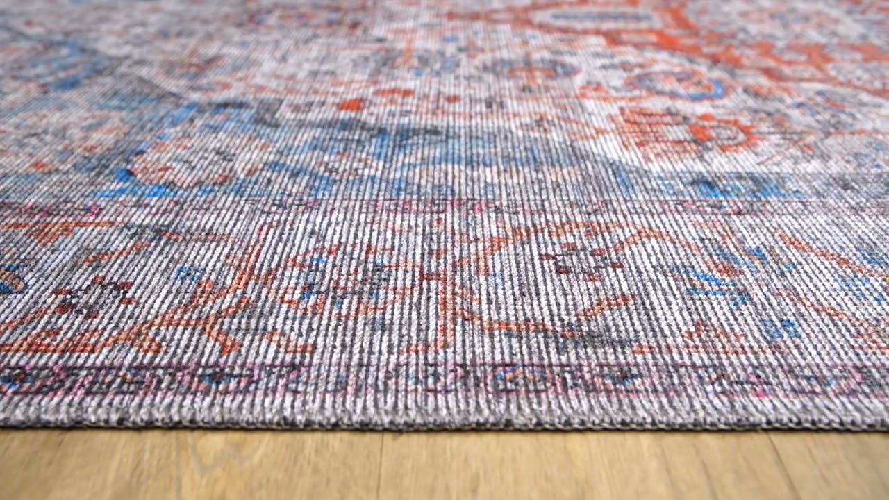 A timeless Persian medallion design in dusty blue, warm red, and soft gray — fully machine washable and built for everyday life.
