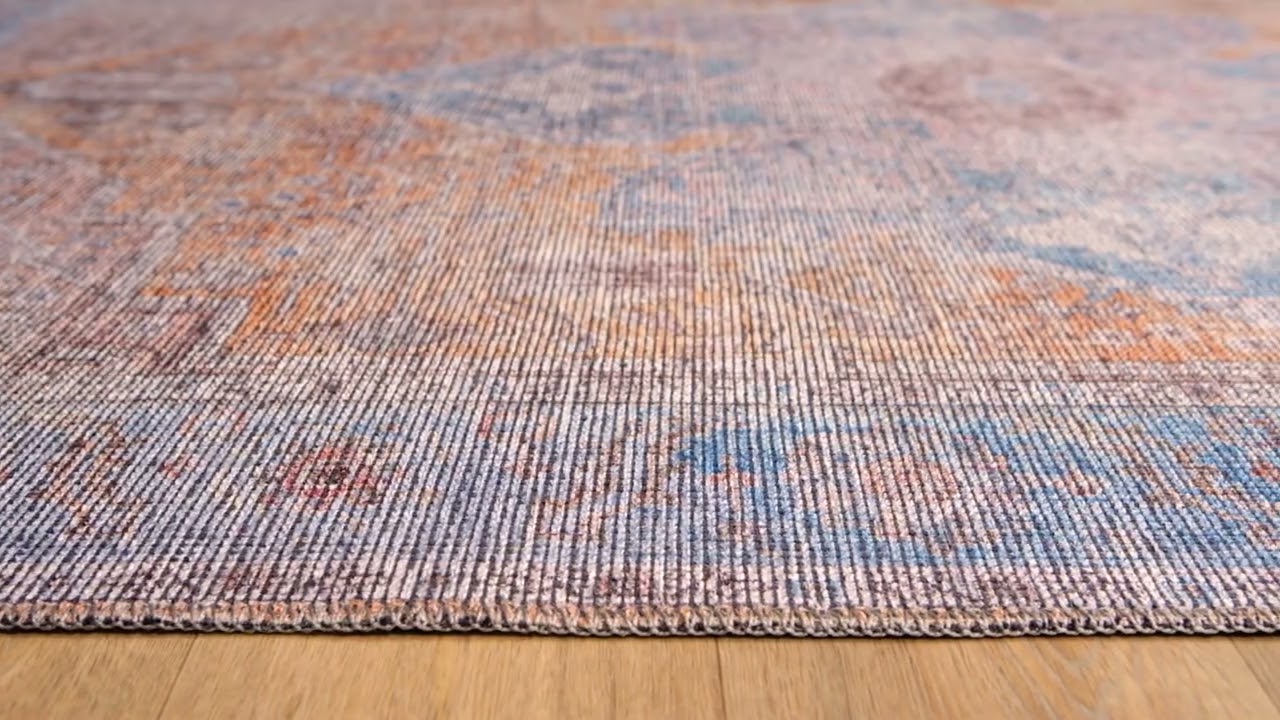 A stunning washable Persian medallion rug with a faded, vintage-inspired palette of purple, orange, and blue — all the beauty of a traditional rug, none of the fuss.