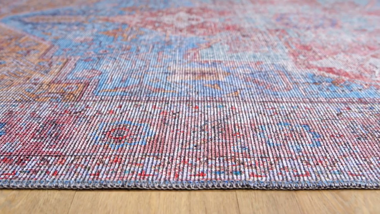A stunning distressed Persian medallion rug in blue, red, and multicolor — fully machine washable and pet friendly. Traditional style meets everyday practicality.
