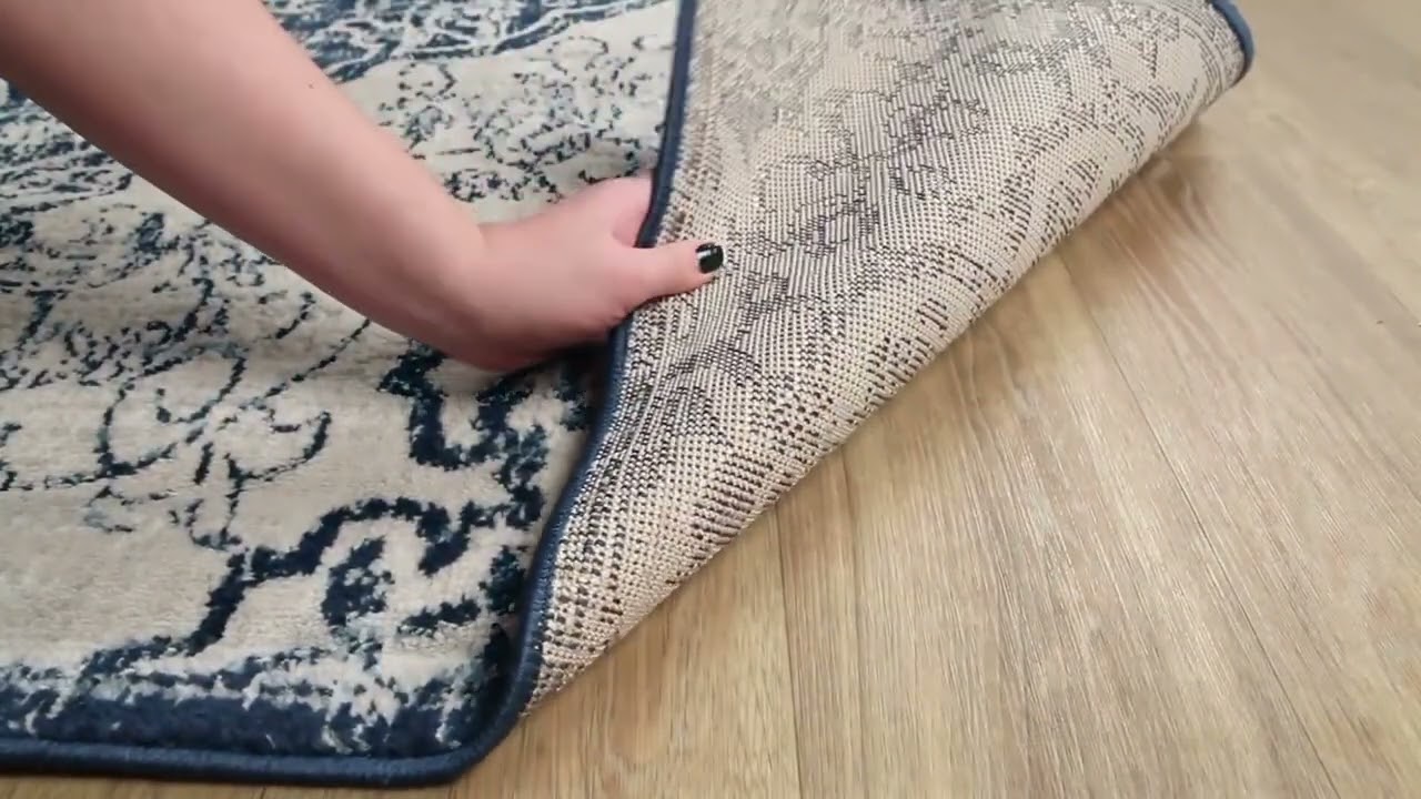A bold navy and ivory medallion rug with a beautifully distressed Persian-inspired design — stain resistant polypropylene built for high-traffic rooms.