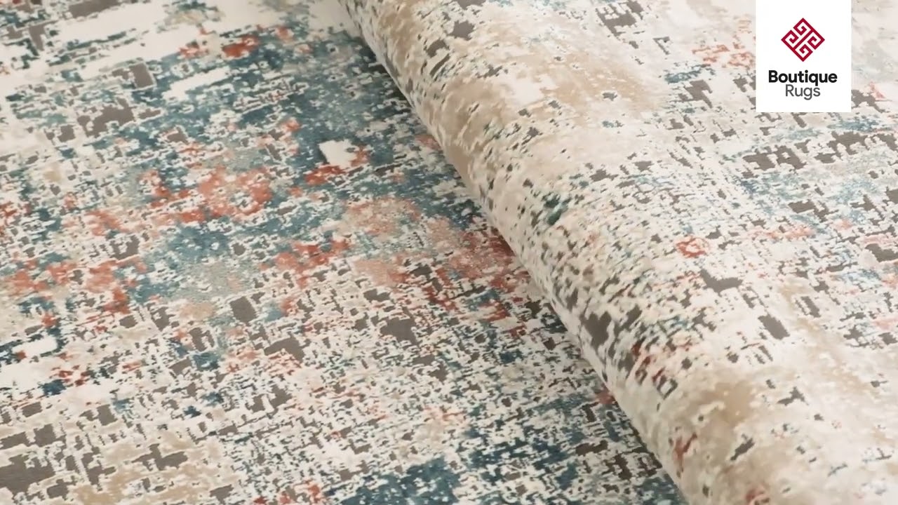 A painterly mix of cream, slate blue, and warm rust in an abstract distressed design — the Priscilla brings effortless modern character to any room.