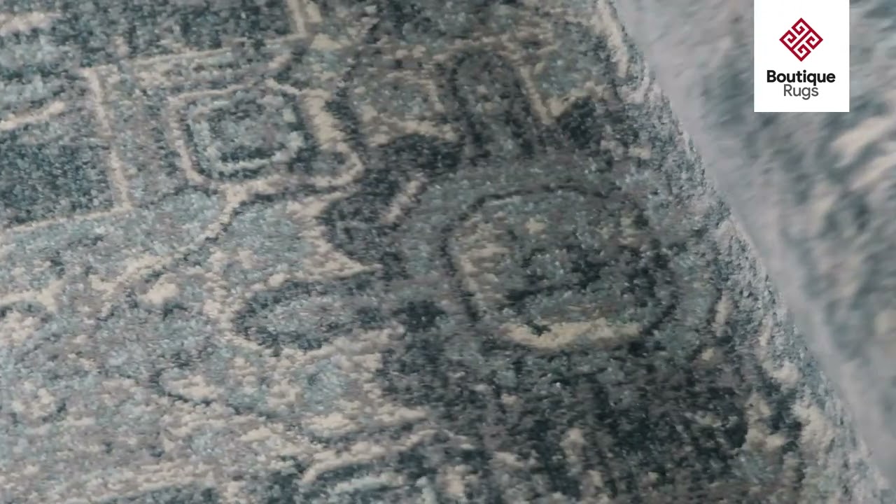 cool paletteA deep slate and navy blue dominates the field, softened by washed-out gray tones that give the rug its signature faded, antique quality — with pale silver-blue accents tracing the medallion and border details.