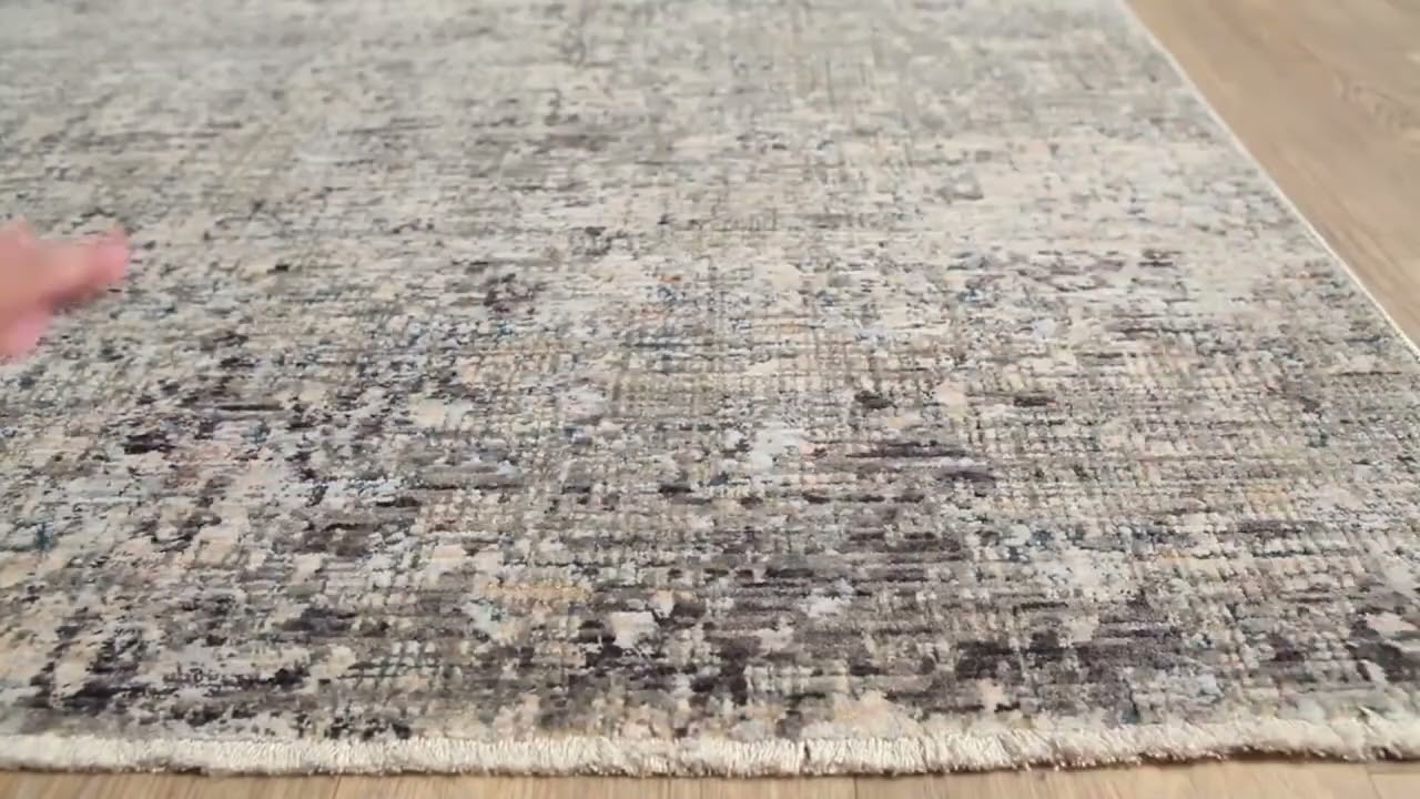 A soft gray and cream abstract distressed rug that effortlessly dresses up or down any space — with a subtle fringe edge that adds just the right finishing touch.