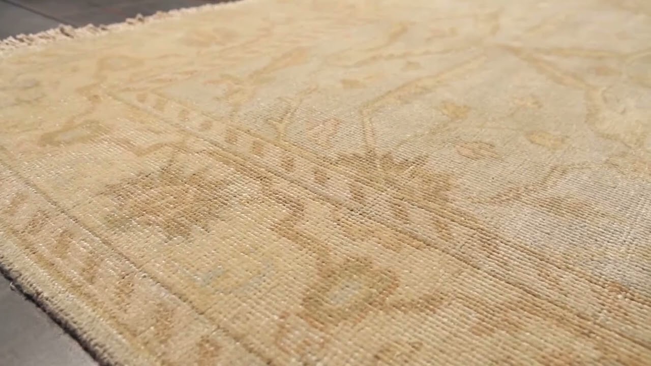 A hand-knotted 100% New Zealand wool Oushak rug with a softly faded floral design in warm beige, cream, and gray — timeless craftsmanship with fringe detail.