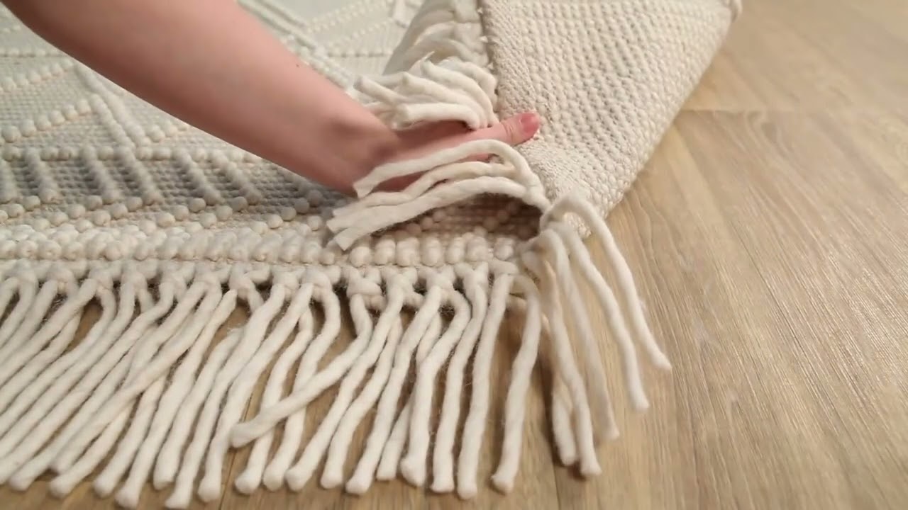 A tone-on-tone trellis diamond pattern in warm beige and cream, hand woven from wool and cotton with fringe detail — texture-rich, timeless, and endlessly versatile.