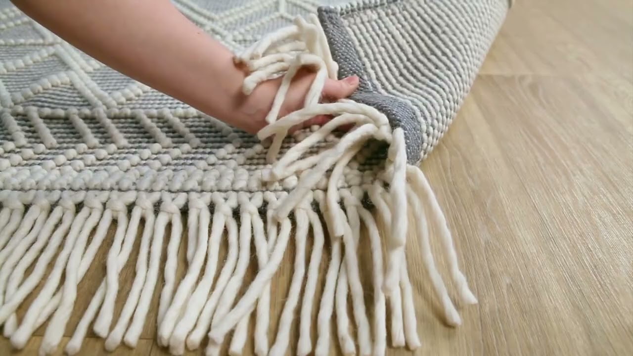 A hand-woven cotton and NZ wool rug with a soft gray diamond lattice and ivory fringe — the kind of neutral that makes every room look more intentional.
