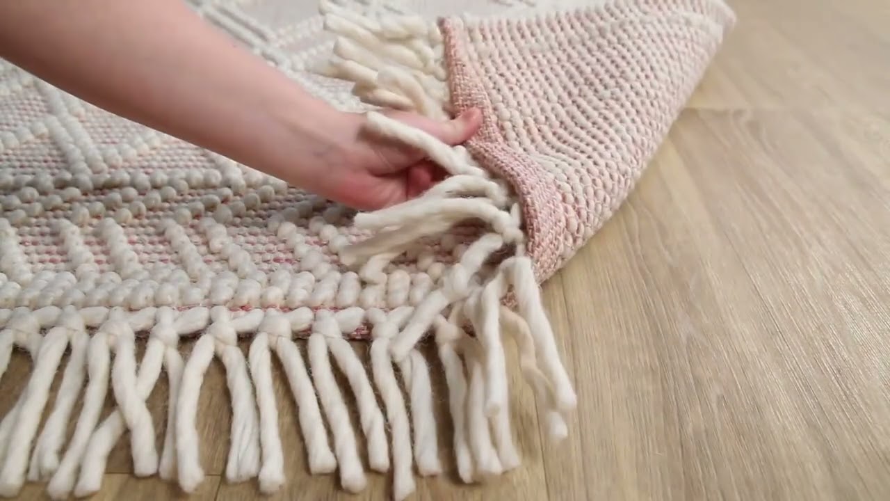A dreamy blush pink trellis flatweave with cream tassels — hand-woven from cotton and New Zealand wool. Subtle enough for any room, charming enough to be the star.