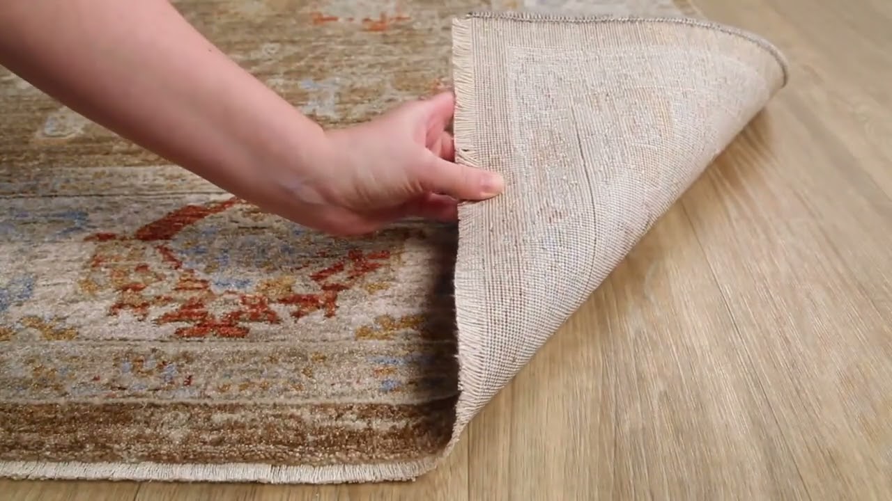 - Warm golden-brown Persian floral design with cream ivory border