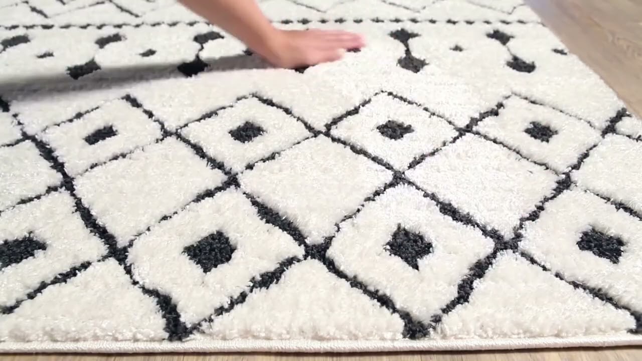 The Ringwood Area Rug brings bold Moroccan-inspired style to any room with its striking black-on-white geometric pattern. Rows of diamonds, trellis lattice, zigzag chevrons, and dotted vertical lines create a layered, tribal feel that's both eye-catching and versatile. The crisp white background makes the charcoal black motifs pop, giving the rug a clean, graphic quality that works beautifully in modern farmhouse, boho, and contemporary spaces.