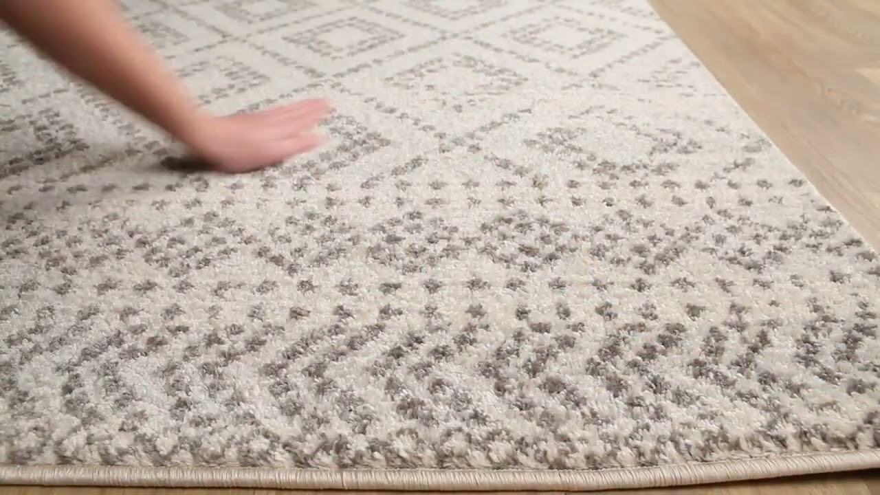 A soft cream and gray diamond trellis rug with a boho-Moroccan vibe — stain resistant, durable, and versatile enough to anchor any room.